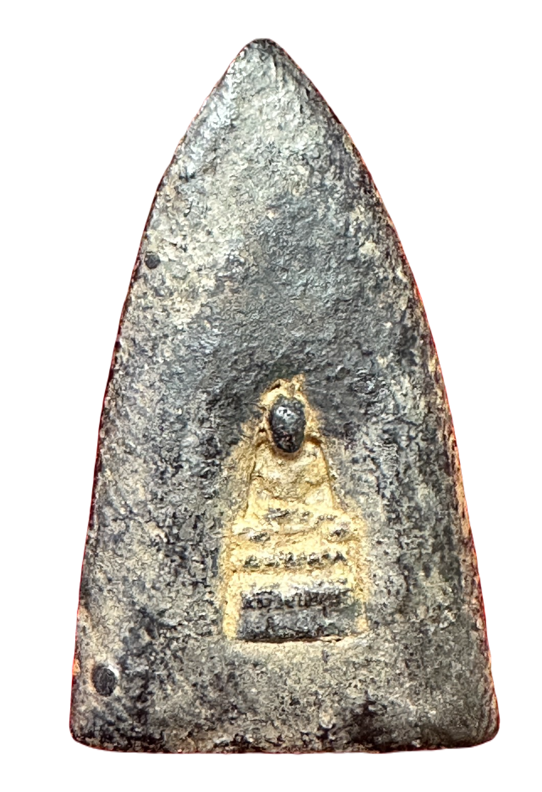 หลวงปู่ทวดหลังสมเด็จโต มวลสารดินกำแพงเพชร(นครชุม) พิมพ์สามเหลี่ยม ทรงเตารีด ผนึกท่านสมเด็จโตหล่อลอยองค์พิมพ์เล็กจิ๋ว ด้านหลังมีทั้งนูนและเรียบ จะผนึกหลวงปู่ทวดองค์เล็ก หรือสมเด็จโตองค์เล็ก บางท่านรู้จักในนาม รุ่นทรงราชย์ รัชสมัย รัชกาลที่ ๕ (สยามนิมิต) วาระสร้างปี 2411(หายากยิ่ง) ส่วนประกอบในเนื้อดินอันได้แก่ว่านดอกมะขาม หรือแร่สีเลือดนก อันเป็นองค์ประกอบหลักของพระที่สร้างขึ้นในยุคโบราณ เนื้อในองค์พระ จากองค์ที่หัก บิ่น เห็นเป็นดินที่ประกอบด้วย่เม็ดกรวดทรายเล็กๆ มีการบรรจุกริ่งดังเดียวกับพระกริ่งเนื้อดินแบบโบราณ เช่น พระกริ่งคลองตะเคียน แม้พิมพ์ทรงจะไปในแนวทางเดียวกับวัดช้างให้ โดยรวมพื้นผิวมีการยุบ แยก ย่น มีการเปลี่ยนแปลงโดยธรรมชาติสร้างผนึกแคลเซียมคาร์บอเนต( แคลไซต์ ) ปกคลุมทั่วองค์พระตามธรรมชาติ โดยการใช้กล้องขยาย 1600 เท่า